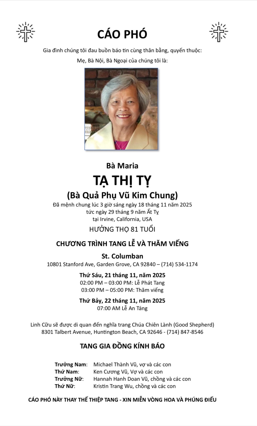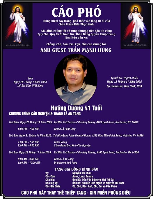 Em cũng đã liên lạc với gia đình của LH Giuse Trần Mạnh Hùng, một gia đình hùng hậu trong Nhóm TĐCTT, với mẹ là TĐCTT Mai Thị Gái và 4 chị là Quý TĐCTT Trần Hằng, Trần Anh, Trần Hạnh và Trần Hiền (gia đình 5 TĐCTT giống như gia đình 5 TĐCTT ở TGP Detroit MI, và gia đình 4 chị em TĐCTT giống như gia đình họ Bùi là Chị Bùi Xuân Hồng ở El Monte CA, Bùi Thị Ánh ở Houston TX, Bùi Thanh Phương và Bùi Thị Hoa cà 2 đều ở Seattle WA), và đồng thời em đã đại diện nhóm phân ưu cùng thông báo cho tang gia biết Nhóm TĐCTT dâng 1 tuần 3 ngày để cầu nguyện cho LH Giuse là thân nhân ruột thịt của TĐCTT theo thông lệ bất thành văn của Buổi Kinh Thương Xót 3 giờ chiều, bắt đầu từ ngay chiều hôm nay, 15/11/2025. Nhóm TĐCTT địa phương Rochester NY, đại diện tổng nhóm, sẽ tham dự hậu sự cho thân nhân của phần tử TĐCTT của mình.