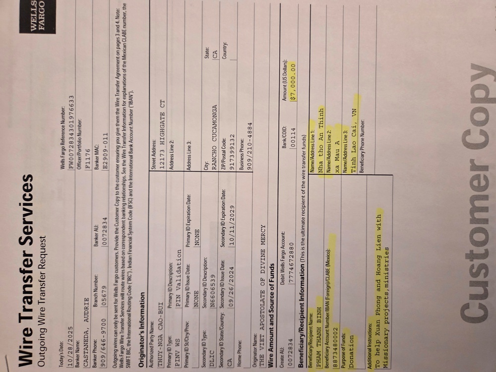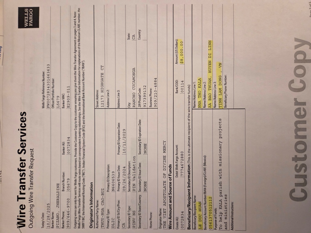 nhận của nhà băng bên Mỹ này. Nhận được số tiền thì xin Tu Hội cung
