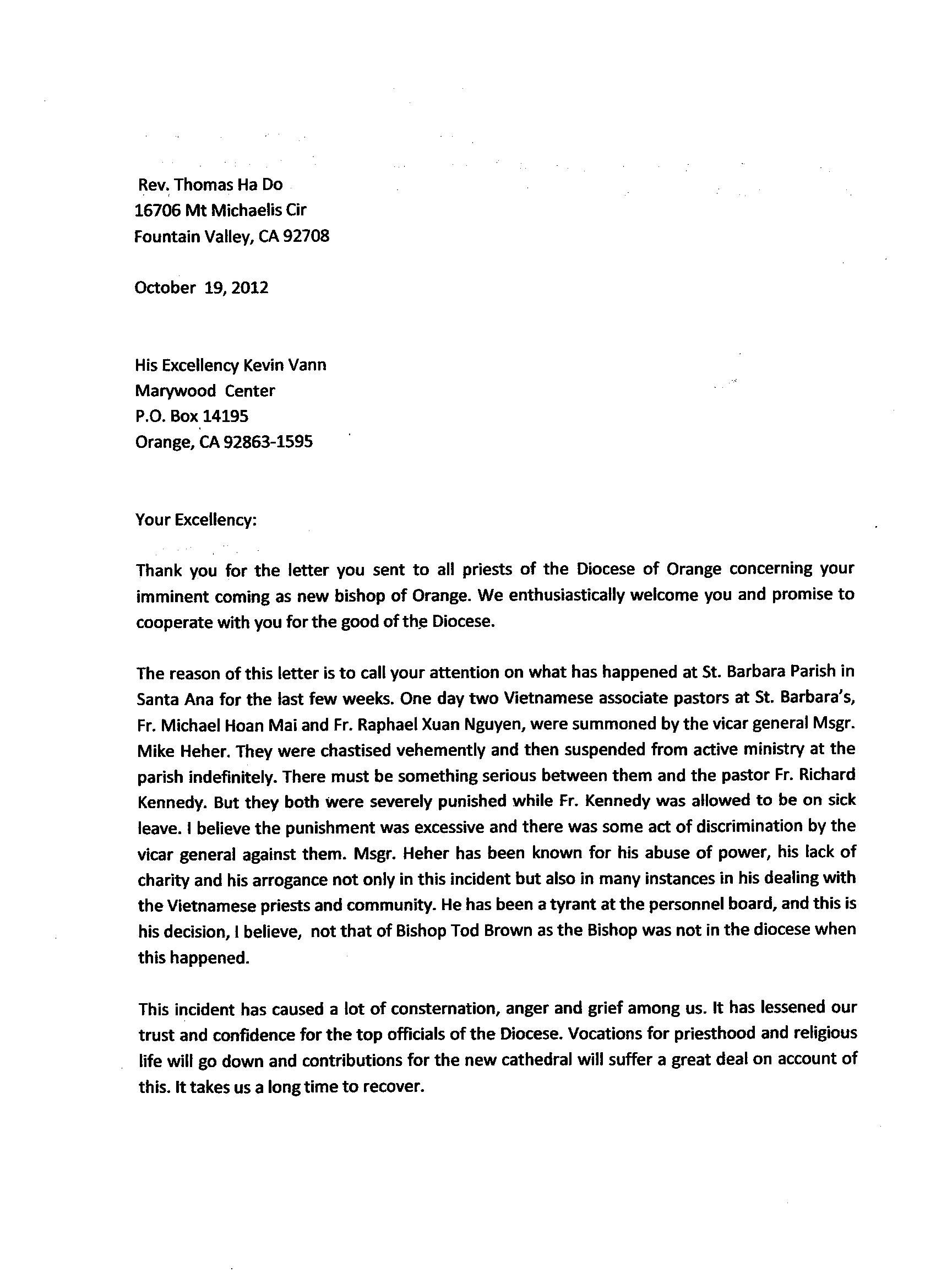 Trước hết, đối với con, Cha Mai Khải Hoàn rất đáng kính, một linh mục, ngoài tư cách và đức độ rất xứng đáng với ơn gọi và sứ vụ linh mục của ḿnh trên 40 năm qua, đă từng giữ các chức vụ không nhỏ trong cộng đồng Công giáo Việt Nam, chẳng hạn chức vụ vừa kể trong Liên Đoàn, và là nguyên Giám Đốc Trung Tâm Công Giáo Việt Nam GP Orange. Thế mà đă đột ngột "biến mất" (cùng một lúc với Cha Xuân Nguyên, vị linh mục cũng đang phục vụ với Cha Mai Khải Hoàn ở chung Giáo Xứ Santa Barbara GP Orange).