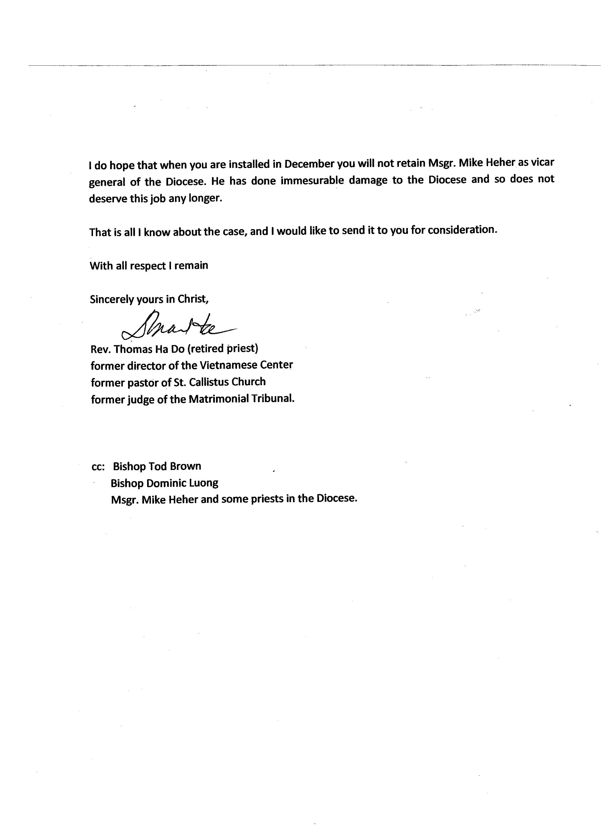 Kế đến, Ngài c̣n gửi: “Một email được gởi ra trên các diễn đàn Công Giáo yêu cầu giáo dân tạm ngưng đóng góp tài chánh cho giáo xứ và giáo phận cho đến khi biết lư do tại sao hai linh mục Việt Nam bị “tạm ngưng mục vụ.”