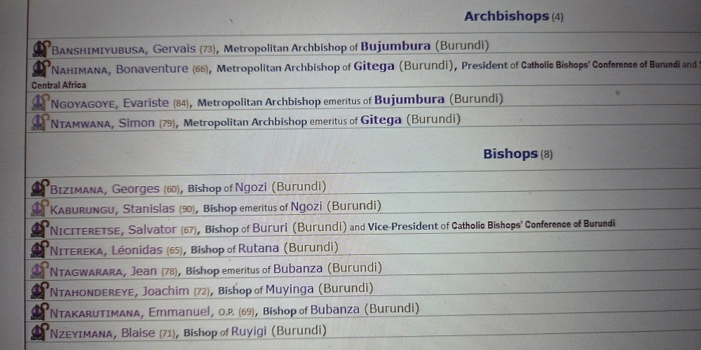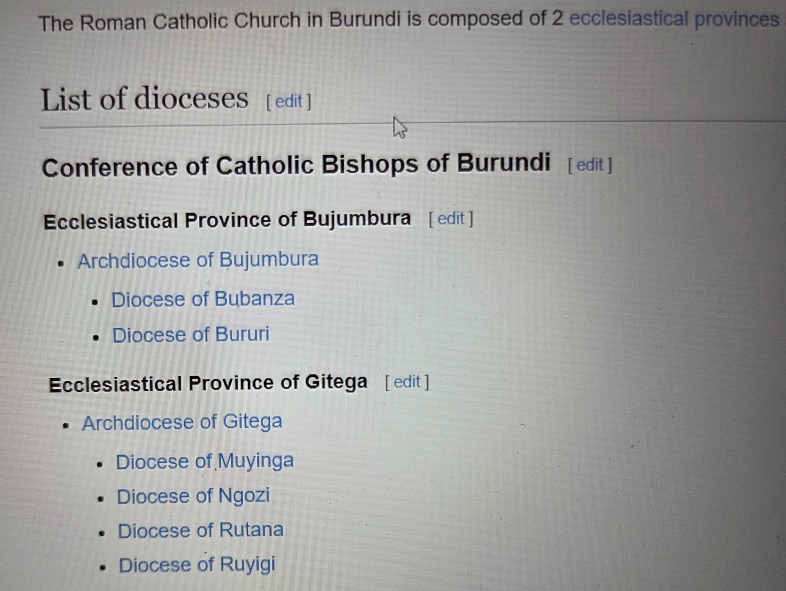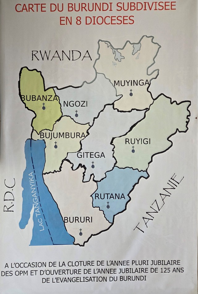 Giáo Hội ở Burundi có 2 Tổng Giáo phận ở 2 Thủ đô Gitera và Bujumbura và 6 Giáo phận