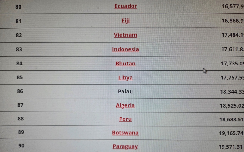 Nếu trong 190 quốc gia được liệt kê ở đây, nước Kosovo 20,383.31 đứng