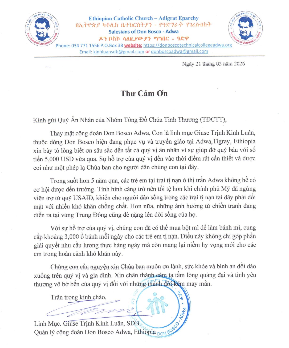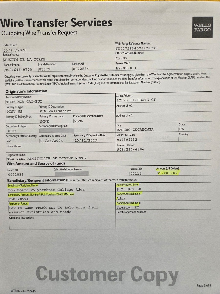 tiền $5,000.00 cứu trợ truyền giáo ở Tigray bắc Ethiopi, như