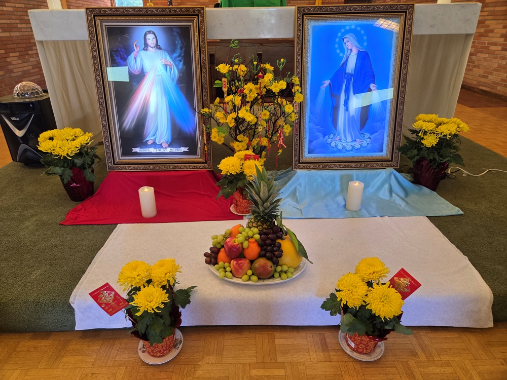 Vẫn là 2 tấm ảnh Chúa Mẹ như các ngày Thứ Bảy Đầu Tháng, nhưng với hoa xuân và mâm ngũ quả