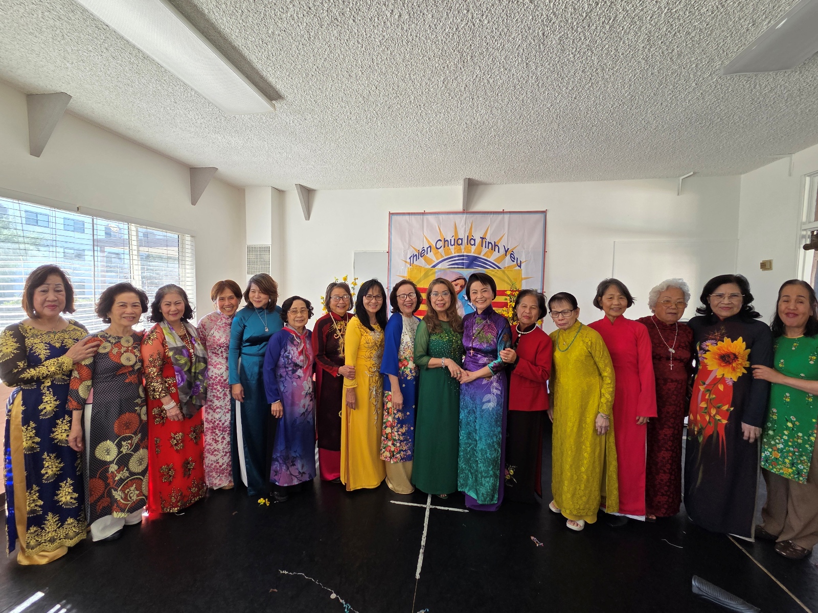 17 vị nữ lưu TĐCTT duyên dáng trẻ trung trong bộ áo dài đủ mầu sắc và kiểu cách làm nên mùa xuân rực rỡ trong Nhóm TĐCTT Nam California. Từ trái với các nàng: