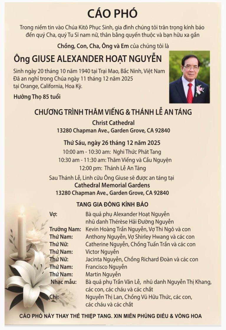 qua đời hôm nay, thứ năm ngày 11.12.2025, qua đời sau Ông Toại 14 năm.